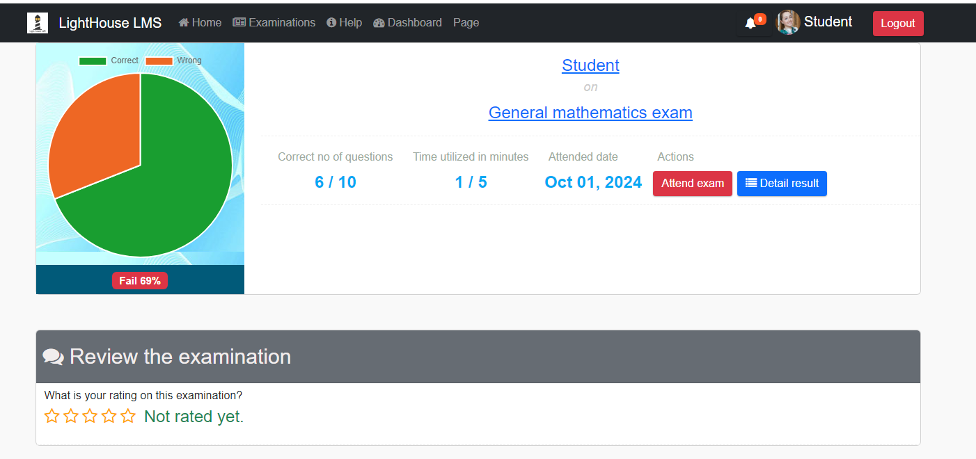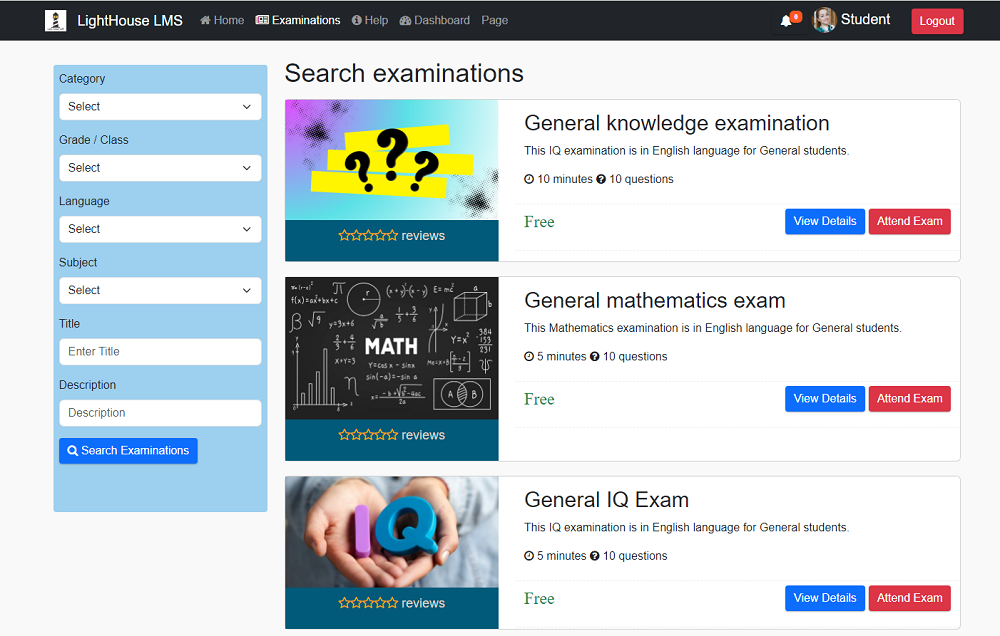 As a student, you can attend exams by clicking the "Attend Exam" button displayed next to each exam in the dashboard, as shown below.