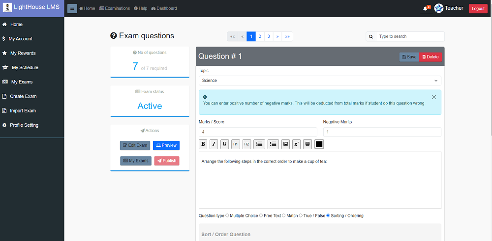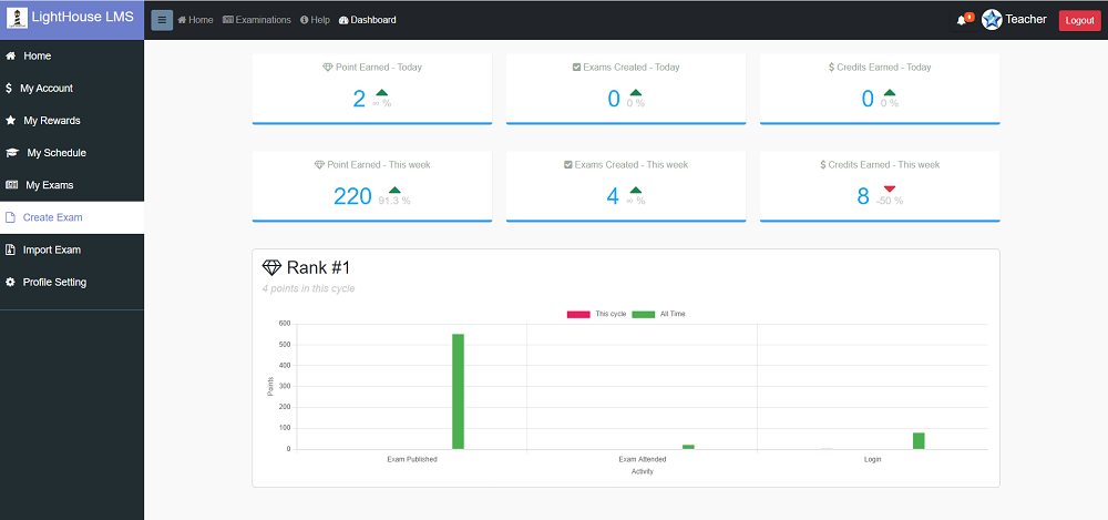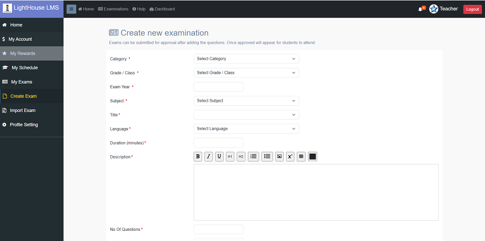 Once logged in as a teacher, you will see the Create Exam menu in the dashboard as shown below.