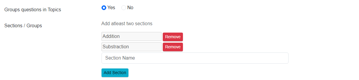 To allow grouping questions into multiple topics, choose "Yes" for the Groups Questions in Topics option and add more than one topic.