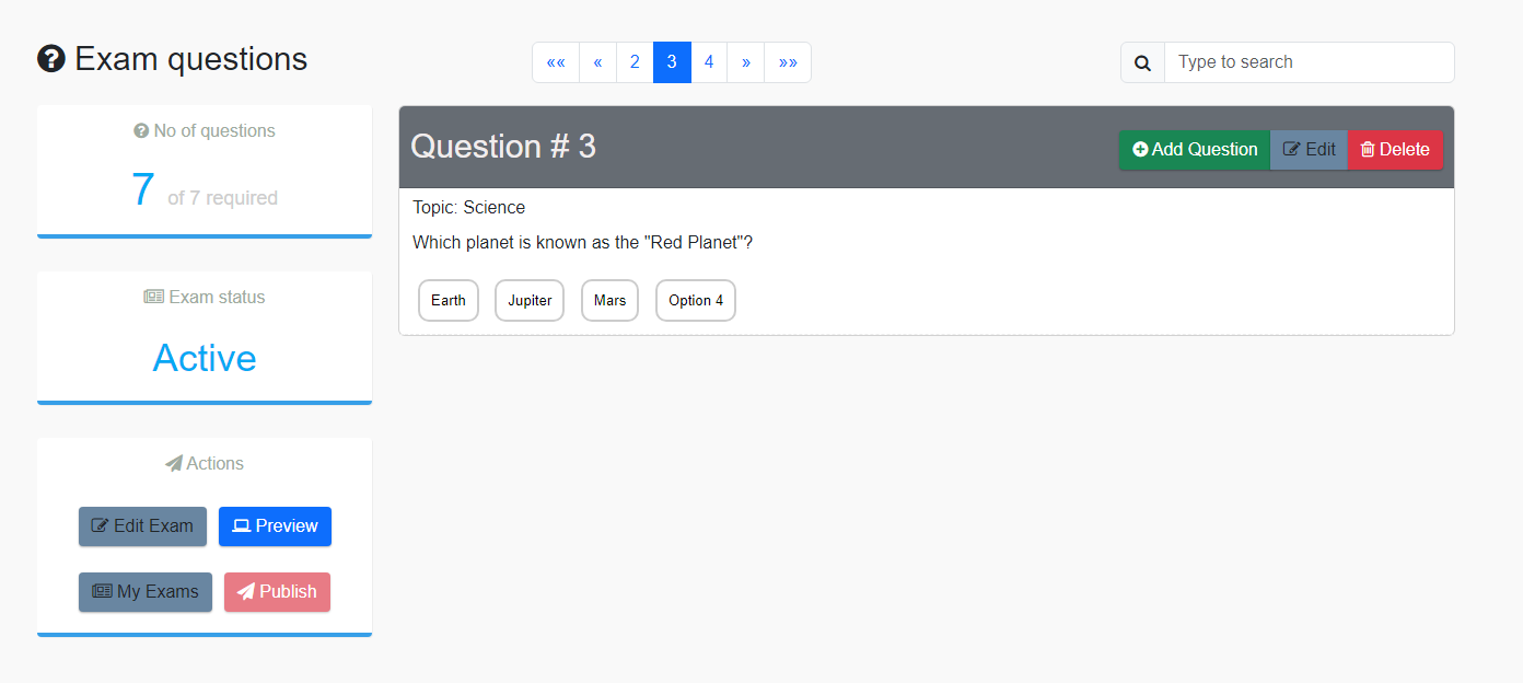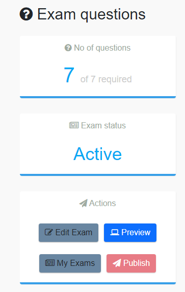 In this step, you will add questions to the examination. The Publish button will be enabled once enough questions are added.